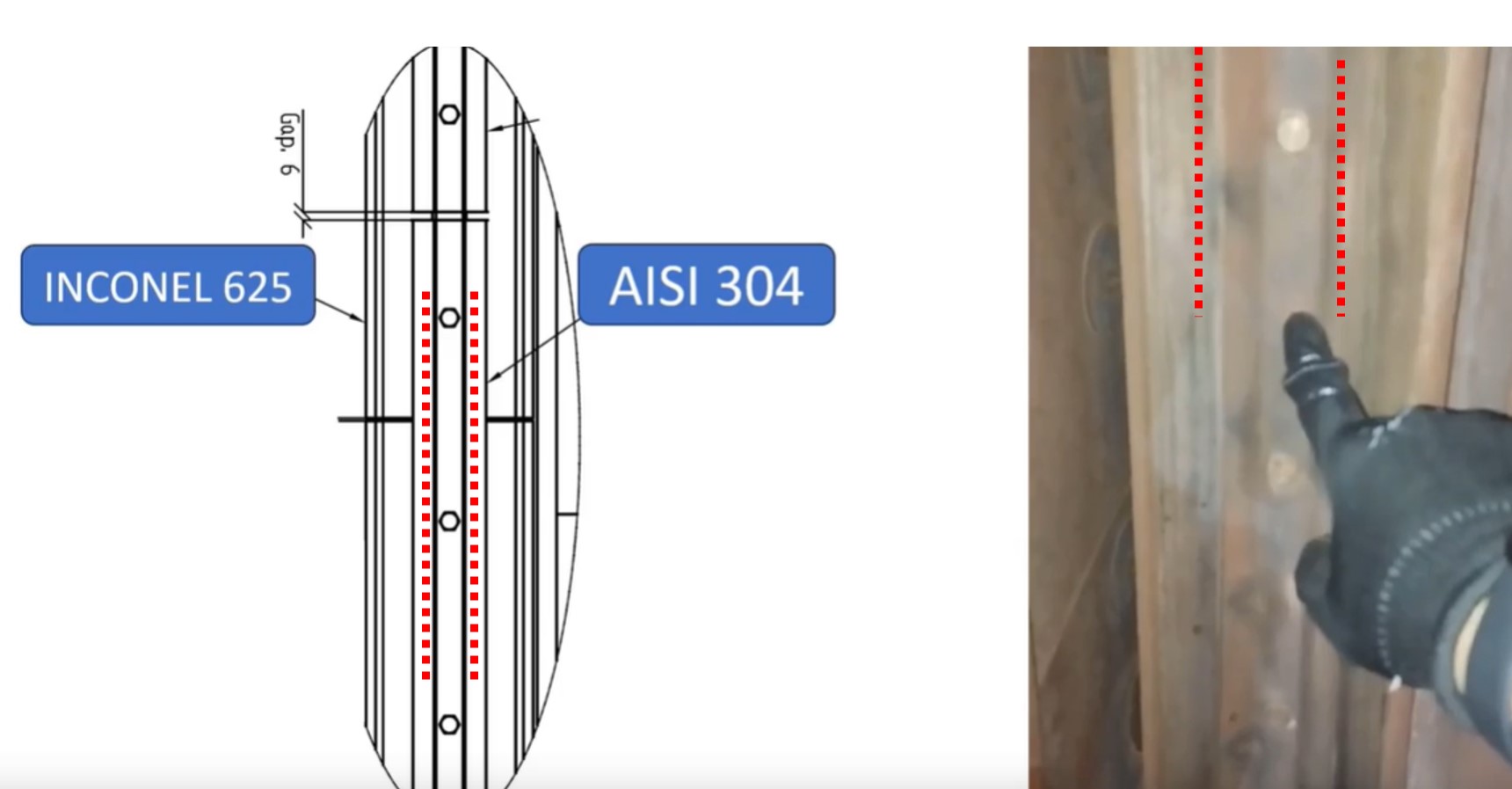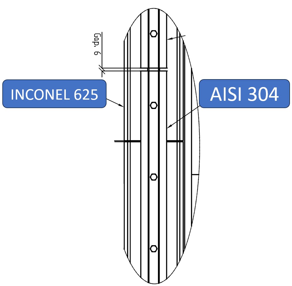 در این گزارش، «دفرمگی سیل پلیت» به صورت دقیقتر بررسی میگردد. همان طور که در تصویر زیر مشاهده میکنید، سیل پلیت با جنس اینکونل625 (INCONEL 625) با یک پلیت فولاد ضد زنگ SS304 از وسط مهار شده است.