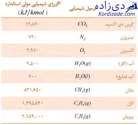 جدول 2. اگزرژی شیمیایی مولی استاندارد مواد مختلف در 298.15 کلوین و یک اتمسفر