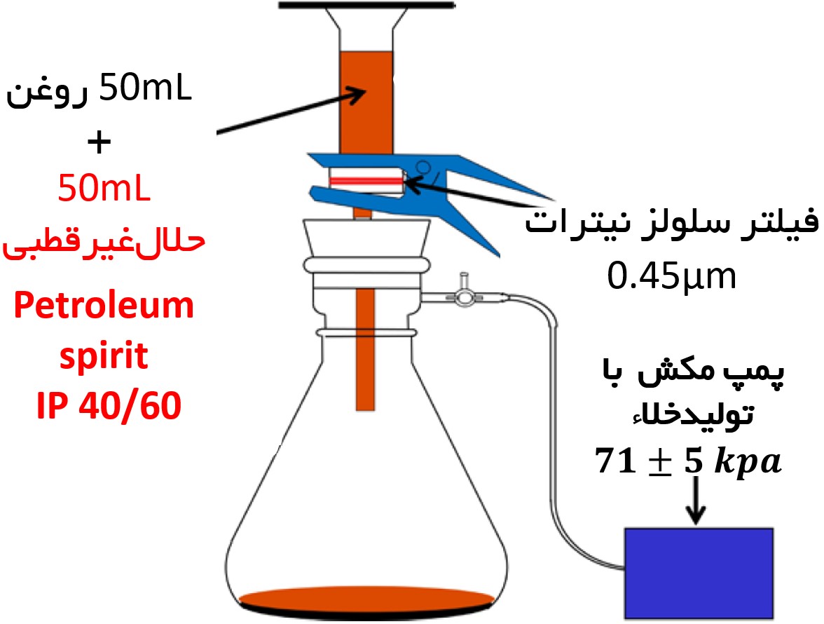 پس از آمادهسازی نمونه روغن، mL50 روغن با mL50 حلال غیرقطبی ( Non-polar solvent) رقیق میشود به مدت 15 دقیقه مخلوط میگردند. این حلال طبق استاندارد ASTM D7843-18 ماده ای به نامPetroleum spirit IP 40/60 می باشد. سپس محلول حاصل به کمک پمپ مکش با ایجاد خلا در محدوده از فیلتری از جنس سلولز نیترات (nitro-cellulose) با مش μm0.45 عبور داده میشود.