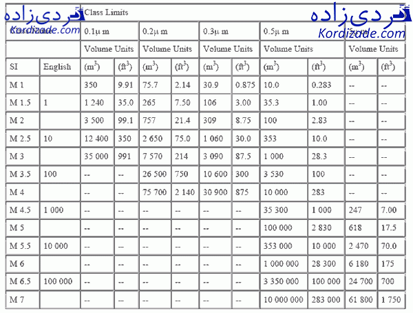 به عنوان مثال براساس استاندارد U.S.A 209E و همانطور که در جدول شماره (6) نشان داده شده است اندازه و مقدار آلودگی ها در کلاس های زیر طبقه بندی گردیده است.