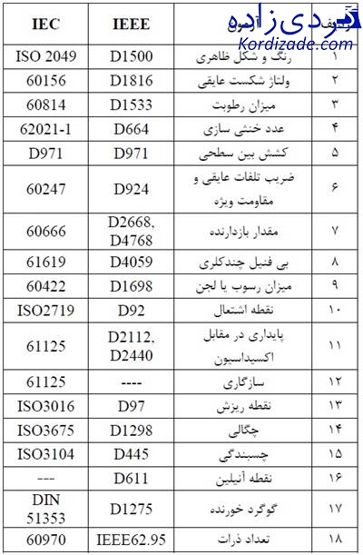 مقادیر مجاز در استاندارد IEEE بر اساس رنگ روغن یا شماره آن مطابق جدول (۲) تعیین می گردد.