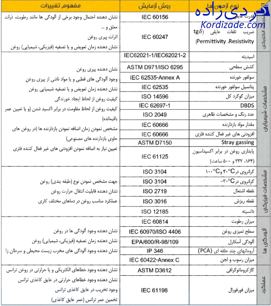– معرفی روش انجام آزمون های آنالیز روغن ترانسفورماتور و حدود پیشنهادی در استانداردهای IEEE و IEC مطابق با آخرین تغییرات؛