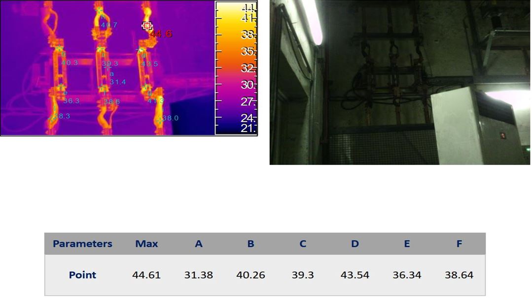 در کارخانه های فولاد سازی با توجه به ماهیت کار این کارخانه توقفات به صورت برنامه ریزی شده و هفتگی انجام می شوند. این موضوع به اطلاع واحد نگهداری و تعمیرات رسید و پس از آن در برنامه تعمیرات قرارگرفت. بعد از بررسی های لازم در این خصوص مشخص شد که محکم نبودن پیچ های تیغه ها و وجود آلودگی ها باعث بالا رفتن دمای این قسمت شده است، که پس از انجام اقدامات اصلاحی، سفت نمودن پیچ ها و تمیز نمودن محل اتصال تیغه های حامل جریان، دماهای نقاط اتصال این تیغه ها به حالت قبل خود برگشت که شکل شماره 5 بیانگر این موضوع می باشد.