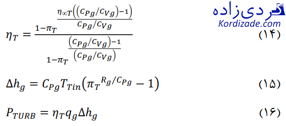 با مشخص بودن دمای ورودی توربین و استفاده از رابطه (4)، آنتالپی گازها در ورود مشخص بوده و می توان با استفاده از روابط زیر آنتالپی گازهای خروجی توربین، بازده ایزنتروپیک و توان تولیدی توربین را محاسبه کرد.